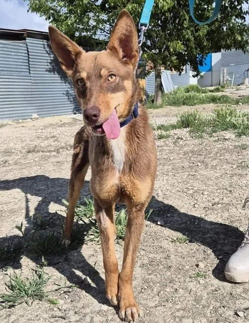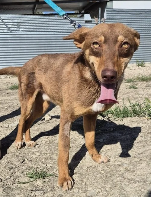 Dürfen wir vorstellen? Das ist Byron, ein junger Podenco-Rüde, geboren im Juni 2024, etwa 50 cm groß, zierliche 10 kg leicht und bereits kastriert. Mit seinem braunen Fell und den ausdrucksstarken grünen Augen verzaubert er sofort – doch was ihn wirklich besonders macht, ist sein liebevoller Charakter.