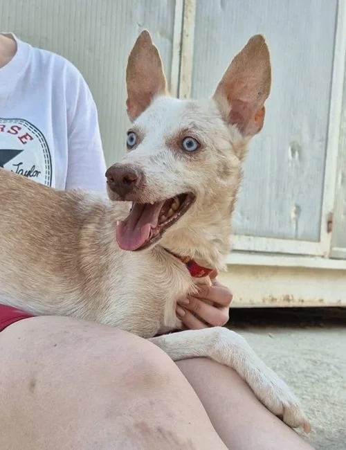 Aktuell sieht er noch etwas “zerloddert” aus - ein Zeugnis davon, das man sich wahrscheinlich nie gut um ihn gekümmert hat. Wenn das Fell erstmal wieder glänzt und ein paar kg mehr auf den Rippen sind, wird Dylan sicher ein wunderschöner Podencoopa - seine schönen blauen Augen strahlen jetzt bereits.